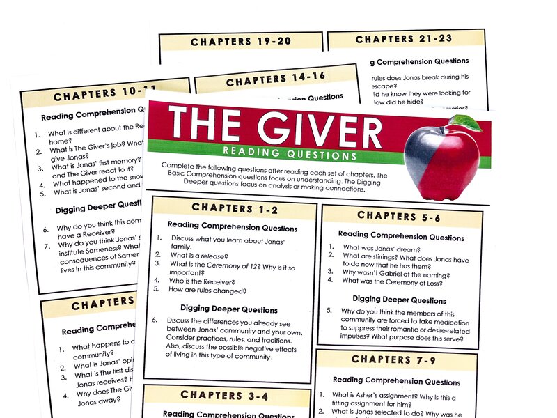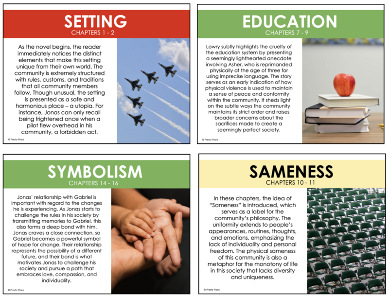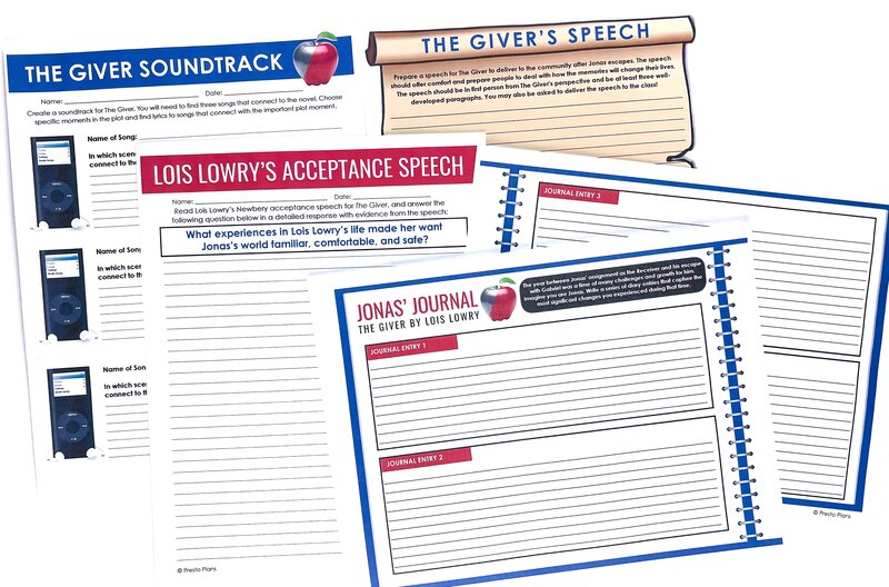 These creative print assignments allow students to explore the novel more deeply, make connections, and respond creatively. They will write a speech from the perspective of The Giver, create a soundtrack for the novel, write Jonas' journal, and examine Lois Lowry's acceptance speech for the Newbery Award for the novel. Finish off your unit with ready-to-use essay topics to encourage students to analyze the text more deeply.