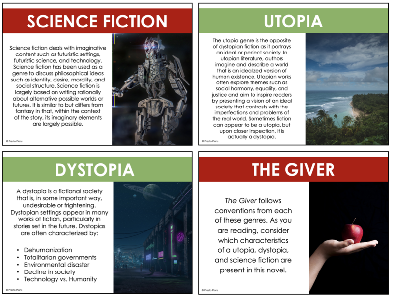 Students will learn about the common characteristics of the utopia, dystopia, and science fiction genres and will explore how Lowry weaves these three genres together in the novel. With links to movie trailers that employ these genres, your students will be absolutely hooked. After your students have finished reading The Giver, use the remaining slides to review how Lowry specifically incorporated elements of each of the genres into the novel.
