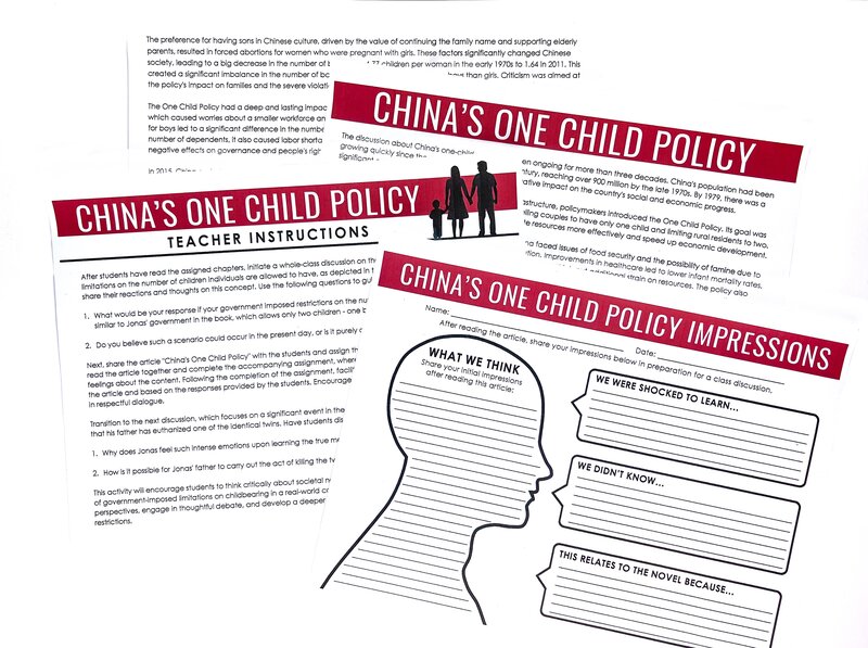 Families in The Giver are selected by the community's Committee of Elders, and partners are assigned two children produced by birthmothers. While this seems like an impossibility in today's society, this activity will give students a real-world connection with the example of China's One-Child Policy.