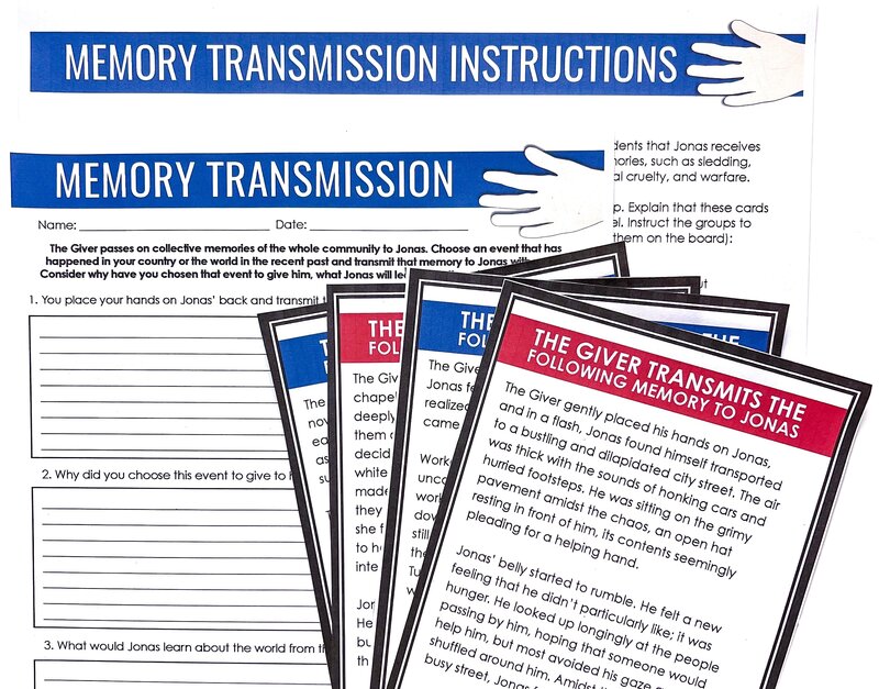 This classroom simulation activity allows students to examine the importance of keeping both painful and joyful memories. In The Giver, Jonas receives memory transmission from The Giver that brings him both pleasure and pain. During this activity, students will receive four new memories and consider whether they are important memories to keep. Finally, students will take on the role of The Giver and decide on one memory from history they think is important to keep.
