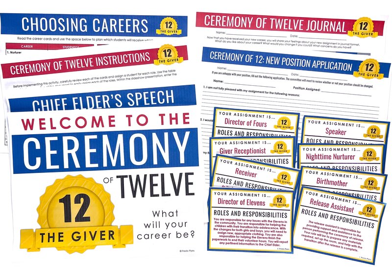 In The Giver by Lois Lowry, children are assigned their careers during The Ceremony of Twelve. Bring this into your classroom and allow your students to empathize with Jonas and the rest of the community by taking on the role of Chief Elder and assigning roles to each of your students! The resource includes absolutely everything you need to successfully facilitate a mock Ceremony of Twelve in your classroom.